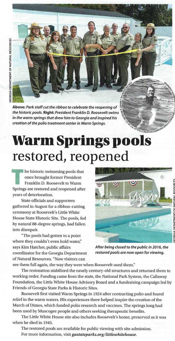 Mike, Dan and Mark are on the final day of construction after having finished the paneling shown center above, the outside construction and the ceiling. The set dressing was in full swing with tables of artifacts collected for furnishing the cabin. ![]() The Warm Springs pools had been painted, refurbished and filled for the filmng of the FDR movie. ![]() The large double-pool area had what might have been dressing rooms on the side. The painters were working hard to get that ready for the shoot. The awning is new, part of the construction done by Mark's crew in preparation for the movie. ![]() Mark's crew built this bridge for the movie. The base of it looks like concrete, but they used monster board and painted it to look like a solid concrete base. ![]() Brenda mirrored in the far side of the pool. These surfaces had been painted to look weathered by the paint crew. When they got there everything was gleaming white. Later in the afternoon Mark got to swim in the pool to make some measurements for the Art Director. The Ranger on site told Mark he had made history as the first person ever to be paid for swimming in the pool. Remarkably, the pool that Mark worked in for the movie was reopened to the public, as described in the October 2025 issue of the Georgia Magazine of Greystone Power. More information can be found at the site gastateparks.org/littlewhitehouse. ![]()