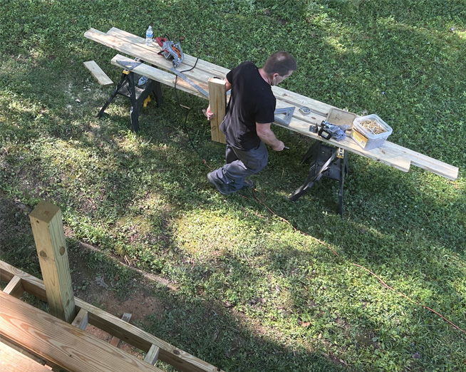 | The next step was the rail on the end of the lower part of the deck. Mark was measuring and making the vertical members at home and bringing them to install. |