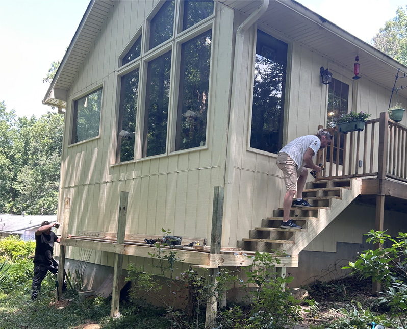 | Mark and Troy work on the placement of the steps and the decking of the lower level. |