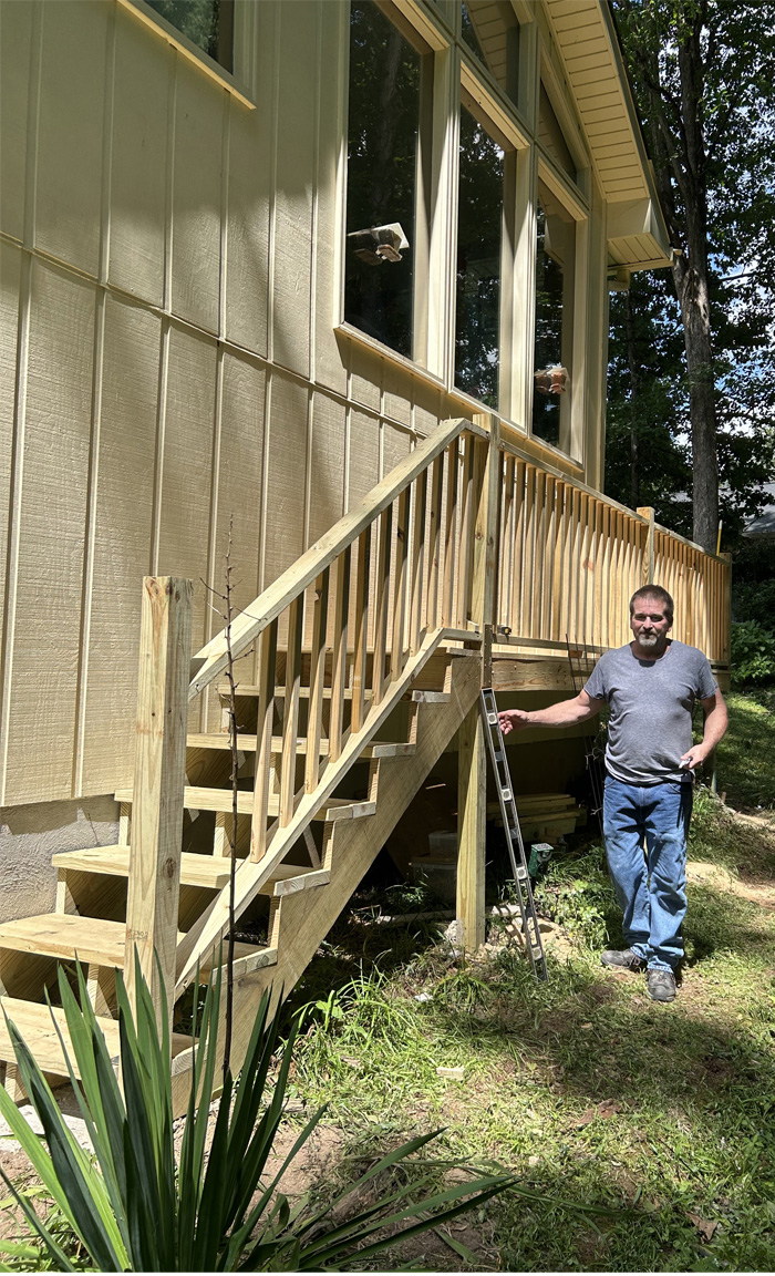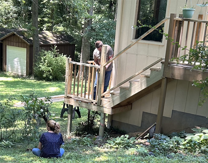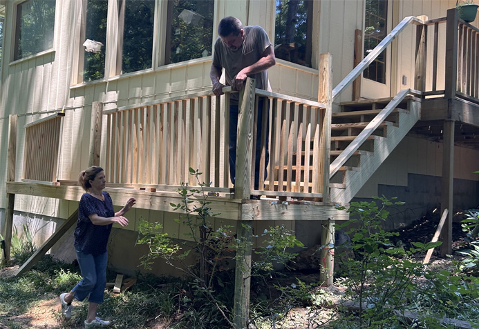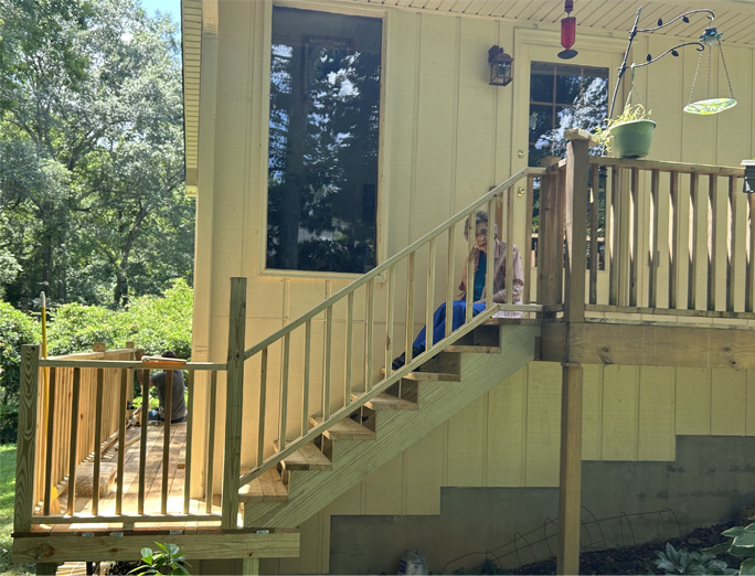 | Brenda at the top of the new stairway on the kitchen side. This gives a view of the new deck on the back of the house. |
