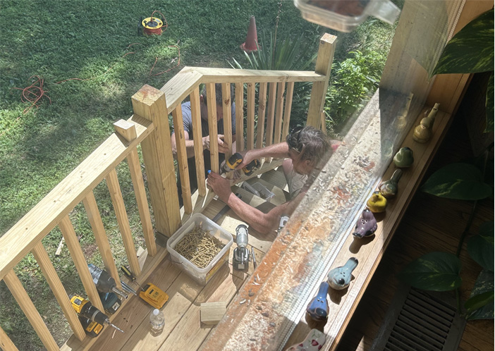 | Putting the back rail in place. Note that he has cut the stair treads for the steps to the ground level at the end of the lower deck, |