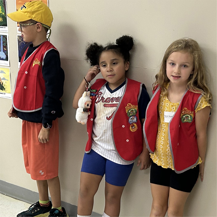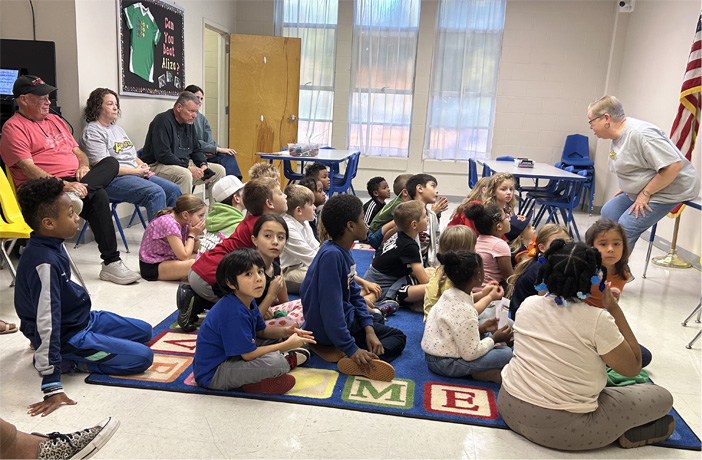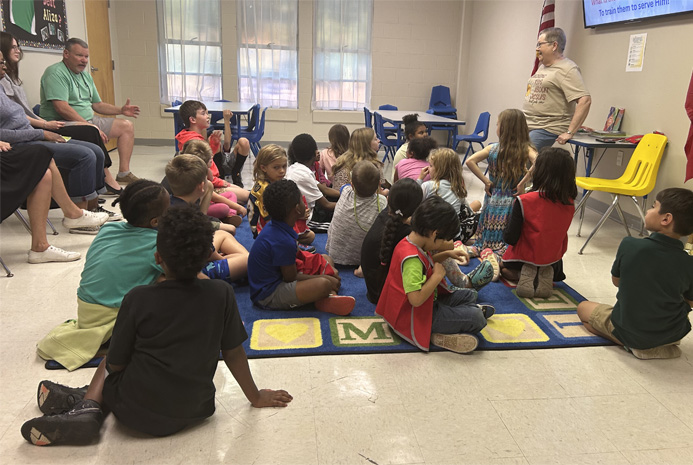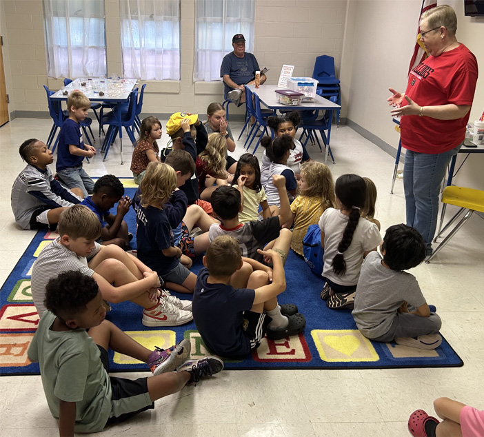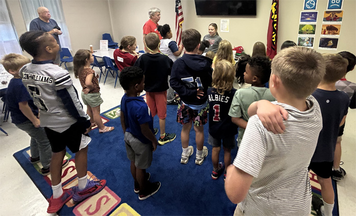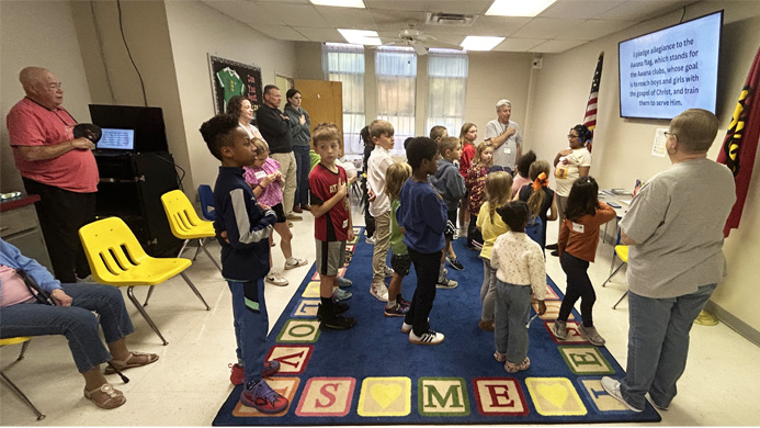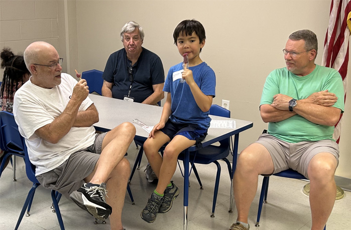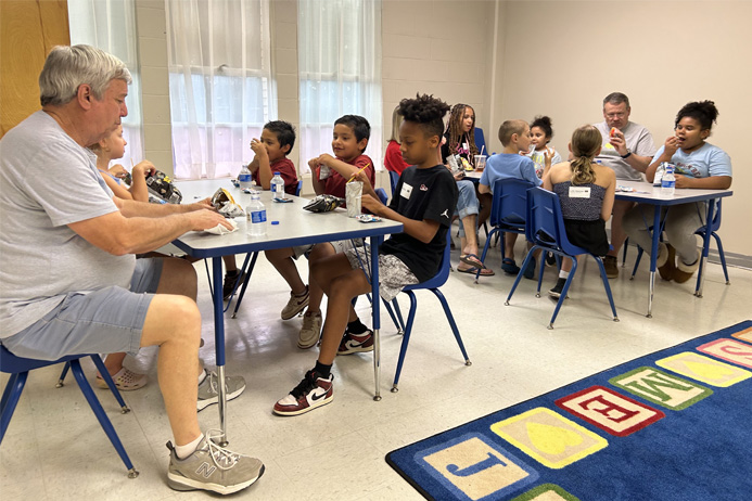 | After our pledges, the Awana group settled in for snack time. Johnny Huffman and Tony Mode accompany them. |