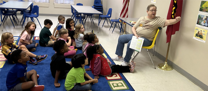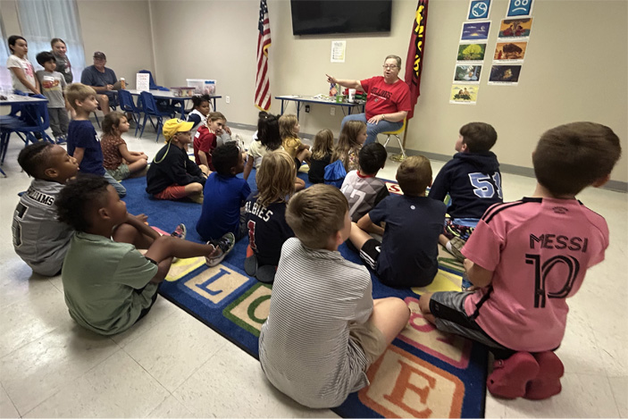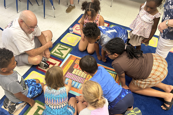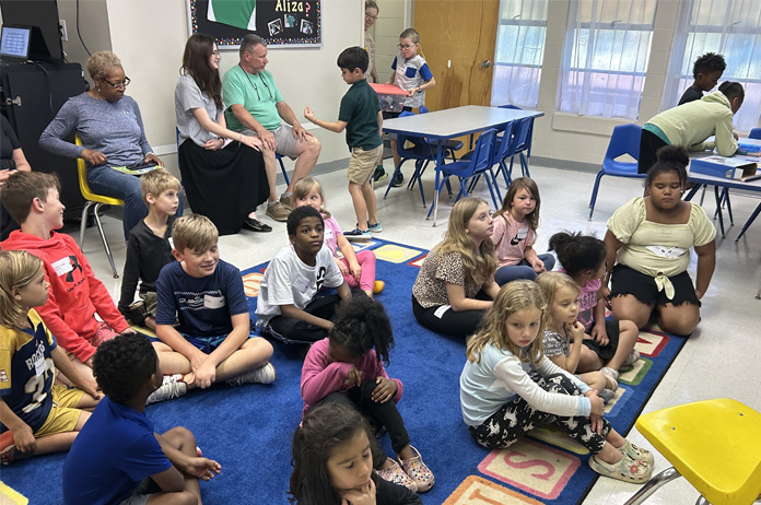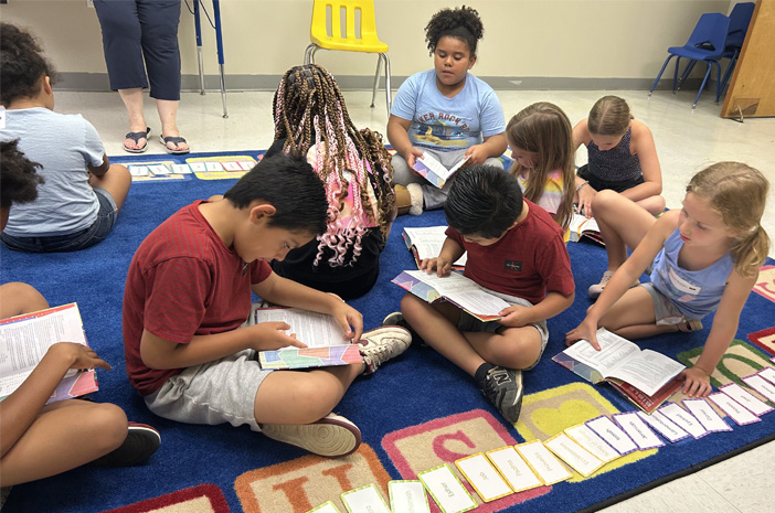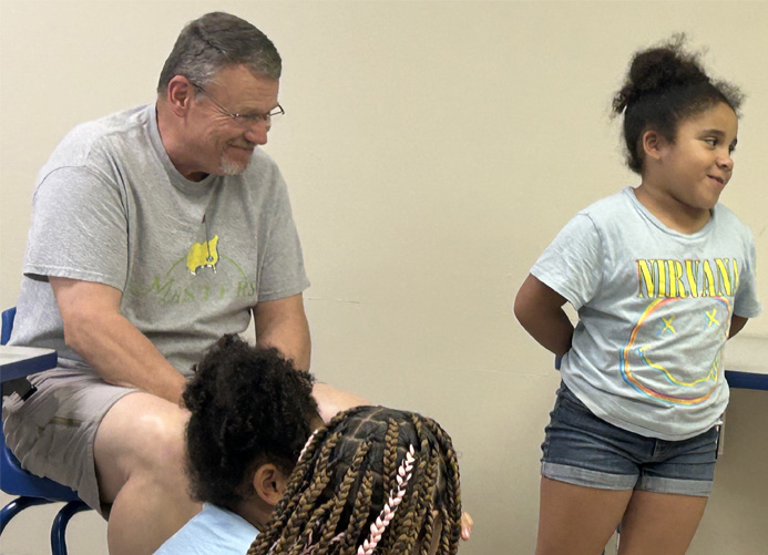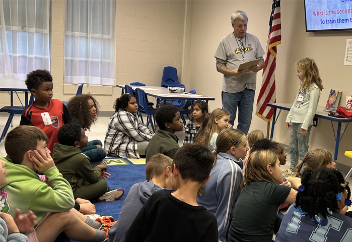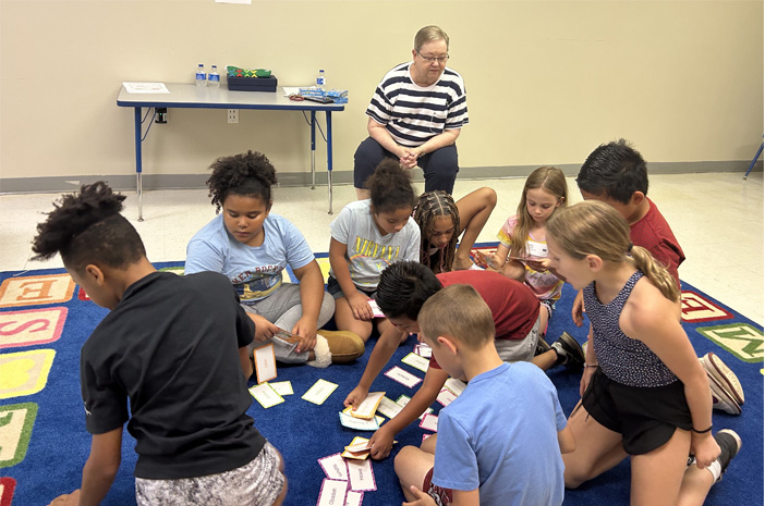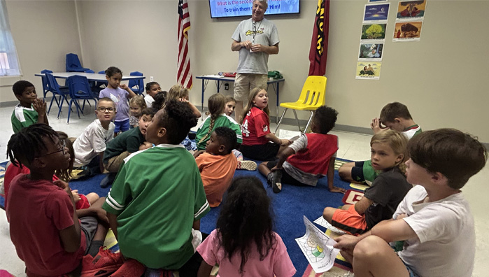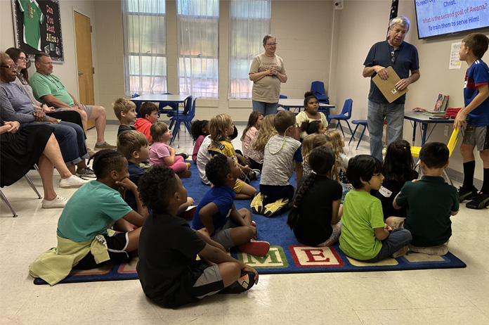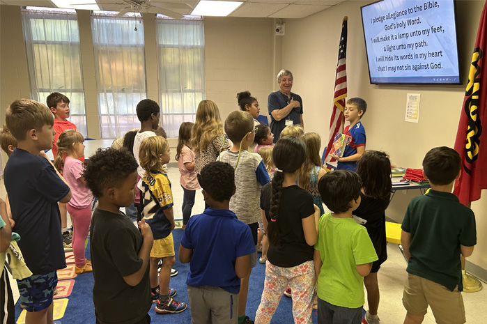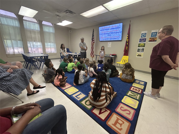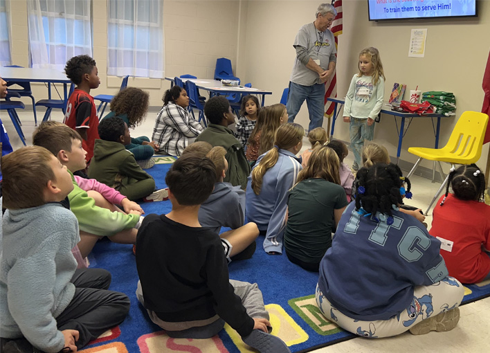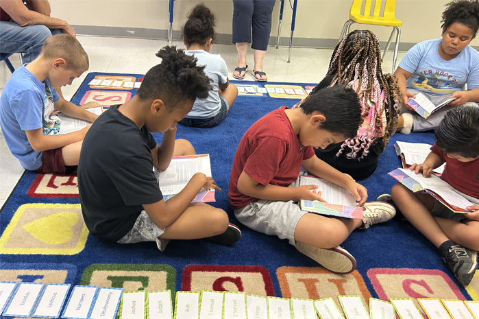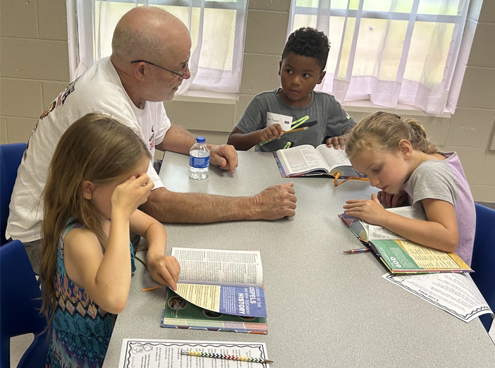Billy Ridgway works with a group of Awanas who are looking up answers to Bible questions. |  |