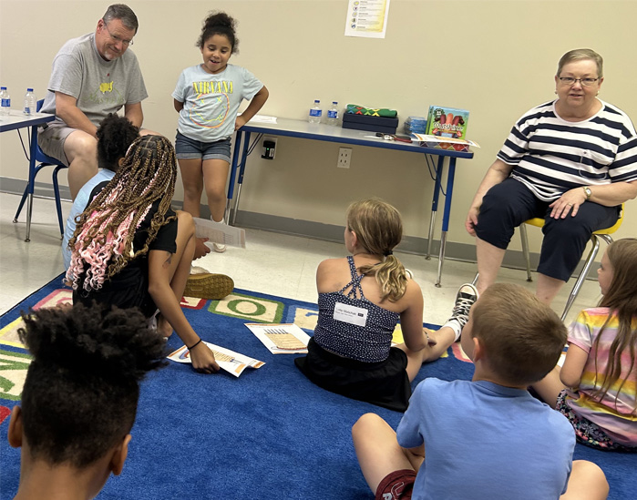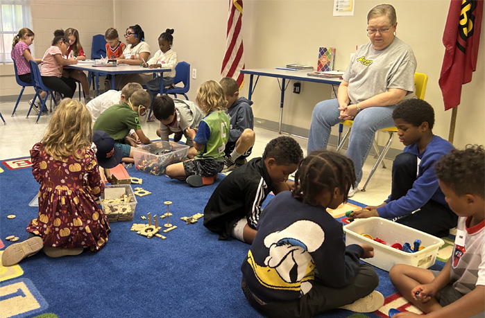 | Johnny Huffman and Tony Mode work with another group of Awanas who are finding answers to questions in the Bible. |