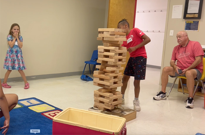 This late May session of Awana was just before our Vacation Bible School for this year, The session began with activities like the large Jenga set of blocks.