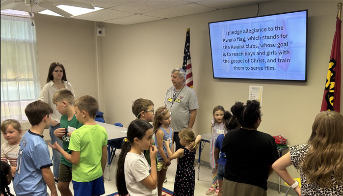 Johnny Huffman chooses an Awana to lead the pledges.This is the pledge to the Awana flag, done after the pledge to the American flag. Leaders Teresa Lamb, Betty Archer, Laura Mode, Tony Mode, Becky Ridgway and Johnny Huffman are seen in the circle of the pledge. |  |