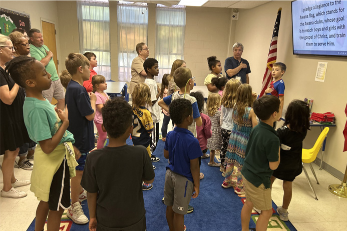 Johnny Huffman chooses an Awana to lead the pledges to the American and Awana flags and to the Bible. |  |