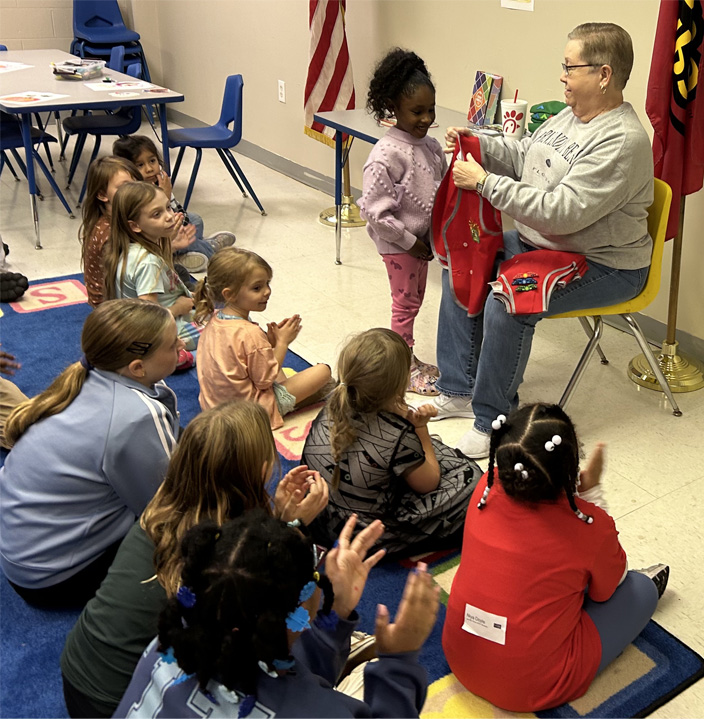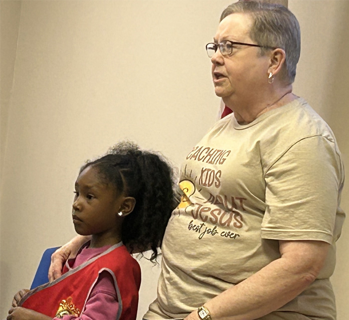 | We move to the time of recognizing advancements in Bible learning. Becky explains the additions to this Awana's red Sparks vest to indicate the results of her learning and saying Bible verses. |
