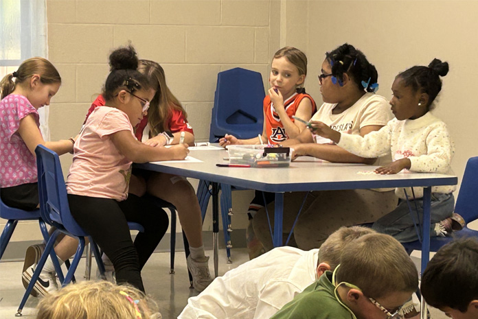 | Some of the Awanas choose the coloring and drawing option at the table. |