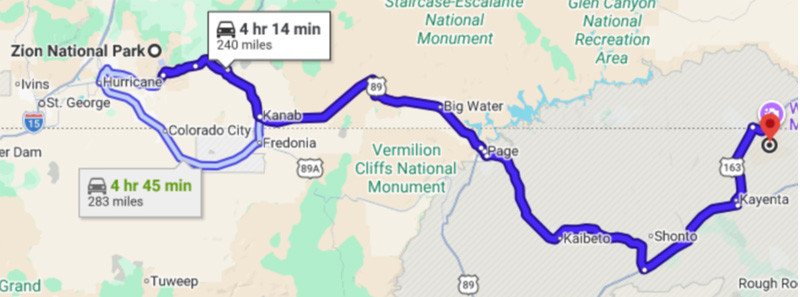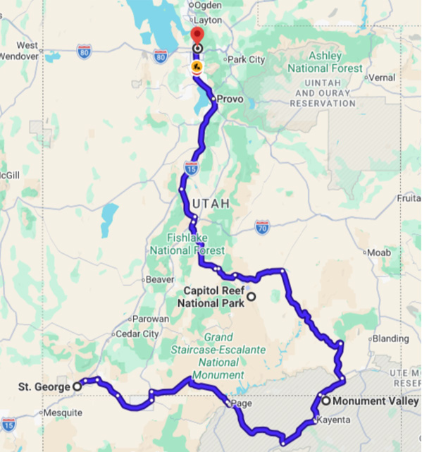 Since their next destinations were to the north of Monument Valley at Capitol Reef and Hickman Bridge, the route shown to the right seems reasonable. |  |