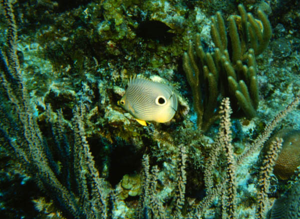 The delicate foureye butterflyfish is a beautiful compliment to the soft world of gorgonia coral.