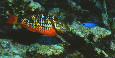 The spectacular juvenile phase of the stoplight parrot fish is always an exciting find. This one is nose-to-nose with a tiny blue chromis.