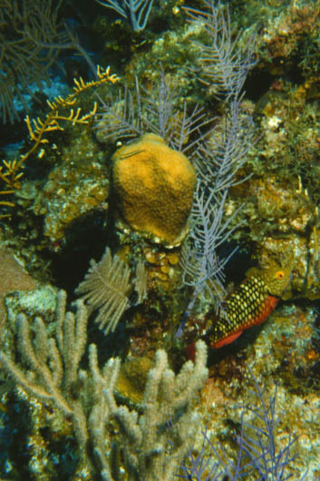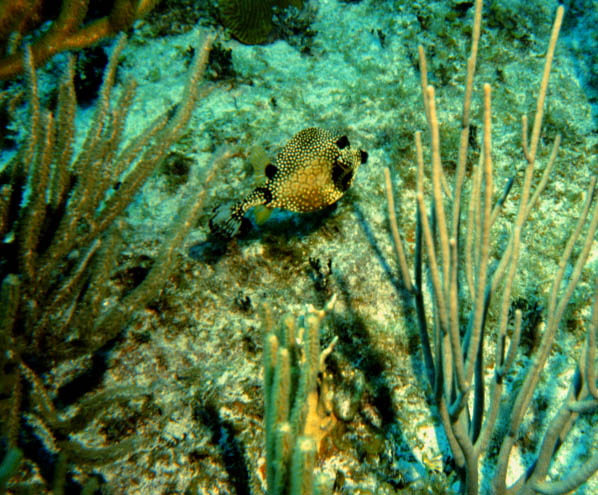 I was surprised to find this spotted trunkfish in its natural habitat on the reef among the soft coral. It seemed quite unafraid, probably because it is built sort of like a turtle, with a hard exoskeleton which offers it a lot of protection against predators.