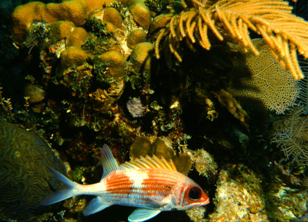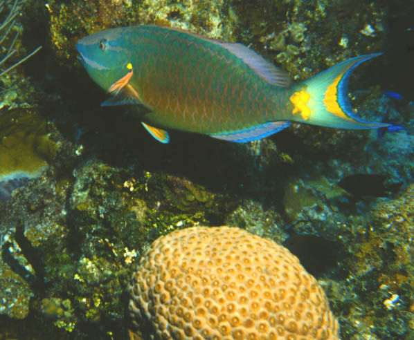 | The terminal phase stoplight parrotfish above is also spectacular, and a great contrast to the juvenile down in the soft coral at left. |