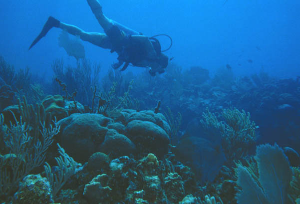 Mark hangs over a reef environment that is dominated by gorgonia soft corals and sea fans. At 30-40 feet, it was a relaxing dive.