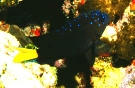| With a black body, this spotted damselfish could hide in the shadows if it weren't for his bright yellow tail and glowing blue freckles. |