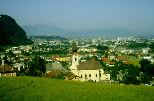 Salzburg![]() This is a view of Salzburg from the road on the east of the city, looking to the south-southwest. We got up and made off for Salzburg at about 8 AM on another lovely, sunny day. The drive through the small wooded mountains of the Salzkammergut region was very pleasant. We parked the car on the left bank of the Salzach River and walked around, looking at some of the histroic buildings of Salzburg: the Cathedras, the Franciscan Church, Collegiate Church, birthplace of Mozart. it is a very pleasant city and I was much more impressed with the beauty of Salzburg than with that of Innsbruck. June 25, 1967 |