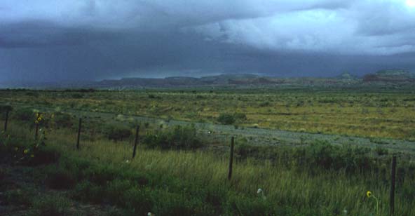 We watched heavy thunderstorm clouds build up over Albuquerque as we approached it from the east. The storms hit us as we climbed out of the city heading west. At this point we are out of the storm, looking back toward Albuquerque at the heavy clouds still hanging over the mountains. It was a pretty spectacular display of thunder and lightning, a desert thunderstorm like we had heard about. August 3, 1982.