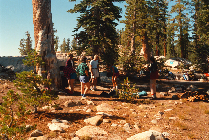 | Today was to be a long hike to the top of a mountain, taking only our daypacks. We were given brief instruction on compass navigation. We had left the trail to the Upper Jackass Lakes when we had hiked in to Lower Jackass Lake and were going to navigate cross-country to pick up that trail rather than backtrack.