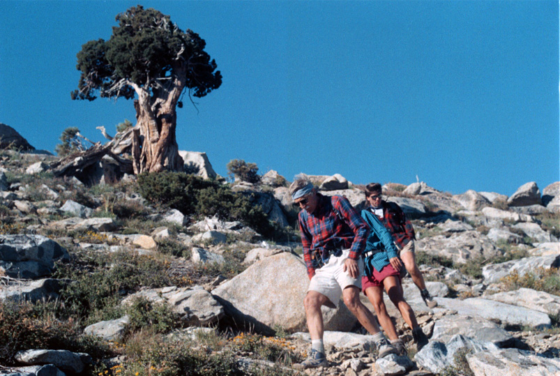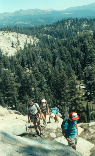 | Tish leads the column up the steep rocky slope leading away from Lower Jackass Lake. Behind her are Mark and then Jeff.