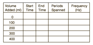 5. Repeat the process after adding 100 ml (same as cm3) of water from a graduated cylinder. Repeat for added volume 200, 300 and 400 ml. 6. Plot your data with frequency in Hz on the vertical axis and the added volume on the horizontal axis.