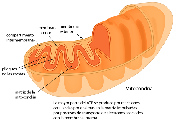 Este dibujo de la estructura de una mitocondria está basada en una perspectiva de Audesirk & Audesirk. Representa una mitocondria individual en forma de salchicha, que tiene típicamente de 1 a 4μ de largo. Hay una gran variedad de estructuras, incluyendo estructuras tubulares con múltiples ramas. Pueden dividirse por fisión, y se fusionan en estructuras complejas. Karp tiene micrografías electrónicas de múltiples variedades. Los elementos comunes incluyen una membrana externa que es porosa, penetrada por proteínas integrales llamadas porinas. También incluyen membranas internas mucho menos porosas, en forma de láminas membranosas de dos capas denominadas crestas.
