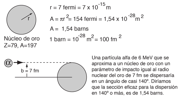 Sección Eficaz de DispersiónEl concepto de sección eficaz, como su nombre indica, se refiere al área efectiva para la colisión. La sección eficaz de un objetivo esférico es ![]() Las unidades de sección eficaz son entonces unidades de área, pero para la dispersión nuclear, el área efectiva es del orden del área de la sección transversal de un núcleo. Para un núcleo de oro de número de masa A=197, el radio determinado por la fórmula del radio nuclear es de unos 7 fermis. ![]() La unidad más común para la sección eficaz de las interacciones de dispersión nucleares es el barn. La sección transversal en barns para la dispersión alfa de arriba a un ángulo seleccionado, es una parte estándar del análisis de dispersión de Rutherford. En el caso de las partículas alfa de 6 MeV dispersadas de una lámina de oro, por ejemplo, no se conoce el parámetro de impacto para cualquier partícula alfa dada, por lo que el cálculo de la fracción dispersa adquiere un carácter estadístico. Para las partículas alfa bombardeando una lámina de oro de 1 micrómetro de grosor, menos de 1 en 100.000 cumpliría con las condiciones para la dispersión de más de 140°. La sección eficaz para la dispersión en ángulos más pequeños será más grande, debido a que las partículas alfa no tiene que venir tan cerca para ser dispersadas a través del ángulo más pequeño. Por ejemplo, la sección eficaz para la dispersión a través de 90° o superior, es 11,3 barns. Para la dispersión de neutrones, no hay repulsión de Coulomb, así que no hay dispersión apreciable a menos que el parámetro de impacto sea menor que el radio efectivo para la interacción fuerte. Por lo tanto, para una geometría objetivo dada, las secciones eficaces son más pequeñas, medidas normalmente en milibarns. Dado que la probabilidad de interacción depende de la fuerza y el rango de la interacción, las secciones eficaces de las interacciones de neutrinos, son muy pequeñas ya que interactúan solamente por la interacción débil.