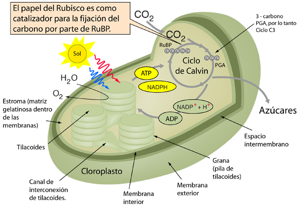 La RuBisCO tiene un peso molecular de 490.000 Daltons y se compone de ocho grandes subunidades y ocho pequeñas subunidades. Las grandes subunidades están codificadas en el propio cloroplasto, mientras que las pequeñas unidades se codifican en el núcleo de la célula.