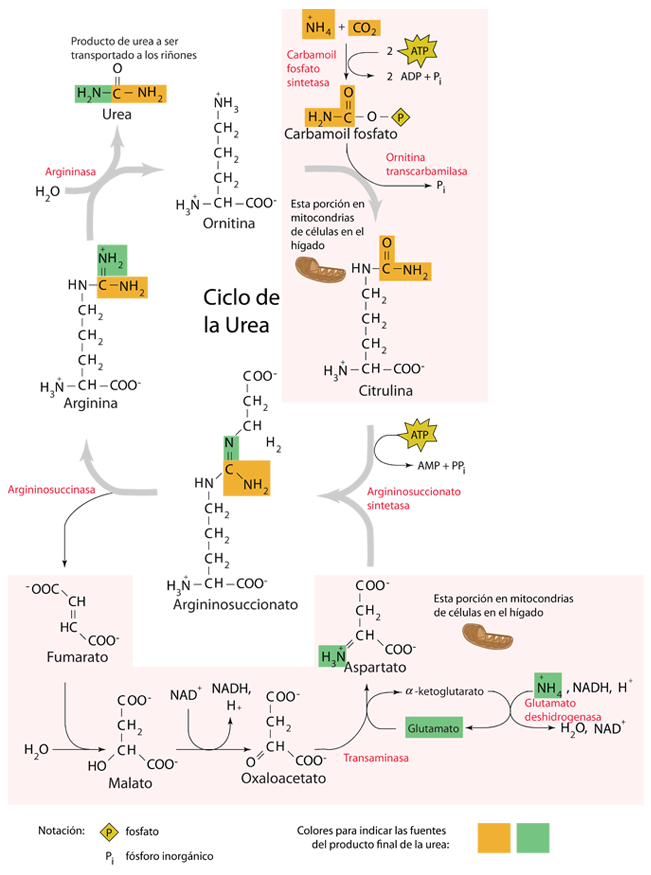 El Ciclo de la Urea![]() El diagrama del ciclo de la urea anterior sigue el patrón del tratamiento en Matthews, para mostrar los principales compuestos químicos involucrados en la preparación de la urea con el fin de eliminar el amoníaco tóxico del cuerpo. Tenga en cuenta que el proceso requiere energía en forma de 3 ATP por ciclo. También hace uso de NADH en un intercambio de energía. Algunas de las reacciones tienen lugar en las mitocondrias de las células del hígado, mientras que el resto tiene lugar en el citosol de esas células. |