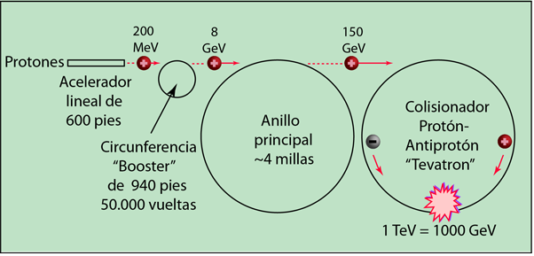 El Tevatron del FermilabDebajo del Anillo Principal del Fermilab en el mismo túnel, hay otro sincrotrón, un anillo magnético superconductor llamado Tevatrón, que aumenta la energía a 1 TeV. Hay un anillo de almacenamiento de antiprotones que logra energías de colisión de aproximadamente 1,8 TeV. El Tevatron hace uso de imanes superconductores para lograr las altas energías y reducir los costes operativos. El Tevatron recibe protones y antiprotones de 150 GeV del inyector principal, y los acelera hasta casi 1000 GeV, o un tera electrón voltios (1 TeV). Viajando a solo 200 kilómetros por hora más lento que la velocidad de la luz, los protones y antiprotones circulan por el Tevatron en direcciones opuestas. Los haces se cruzan entre sí en los centros de los detectores CDF de 500-ton y el DZero localizados dentro del túnel del Tevatron, creando ráfagas de nuevas partículas. (Fermilab)