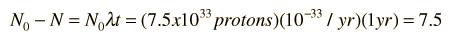 Modelado de la Probabilidad para el Decaimiento del ProtónLa búsqueda experimental del decaimiento del protón se llevó a cabo debido a las implicaciones de las teorías de la Gran Unificación. El límite inferior del tiempo de vida se proyecta ahora que es del orden de τ = 1033 años. La probabilidad de observar una desintegración de protón se puede estimar a partir de la naturaleza del decaimiento de partículas, y la aplicación de las estadísticas de Poisson. El número de protones N se puede modelar por la ecuación del decaimiento ![]() donde λ = 1/t = 10-33/ año es la probabilidad de que decaiga cualquier protón dado en un año. Como la constante de decaimiento λ es tan pequeña, el exponencial se puede representar por los dos primeros términos de las series exponenciales. ![]() Para una pequeña muestra, la observación de una desintegración de protón es infinitesimal, pero supongamos que tenemos en cuenta el volumen de protones representados por el detector de neutrinos Super Kameokande en Japón. El número de protones en el volumen del detector según informa Ed Kearns de la Universidad de Boston, es de 7,5 x 1033 protones. Durante un año de observación, el número de decaimientos de protones esperados es entonces ![]() Sobre un 40% de la superficie alrededor del tanque detector está cubierto por tubos fotodetector, y si se toma eso como la eficiencia nominal de detección, se espera que ocurran unas tres observaciones de eventos de decaimiento de protones por año, basado en un tiempo de vida de 1033 años. Hasta el momento, no se han visto eventos convincentes de decaimiento de protones. Las estadísticas de Poisson, proporciona un medio conveniente para evaluar las consecuencias de la ausencia de estas observaciones. Si se supone que el promedio es a = 3 decaimientos observados por año, entonces la función de distribución de Poisson nos dice que la probabilidad de cero observaciones de decaimiento es ![]() Esta baja probabilidad de un resultado nulo, sugiere que el tiempo de vida propuesto de 1033 años, es demasiado corto. Si bien esto no es una evaluación realista de la probabilidad de observaciones porque hay un número de posibles vías de decaimientos, sirve para ilustrar cómo, en principio, incluso una no observación se puede usar para refinar una proposición de tiempo de vida. |